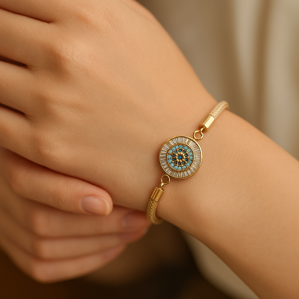 Un diseño que combina la elegancia del acero bañado en oro con la protección ancestral del ojo turco. Su centro en tonos azules y dorados irradia luz y energía positiva, convirtiéndolo en un accesorio perfecto para quienes buscan estilo y un toque de espiritualidad en su día a día.