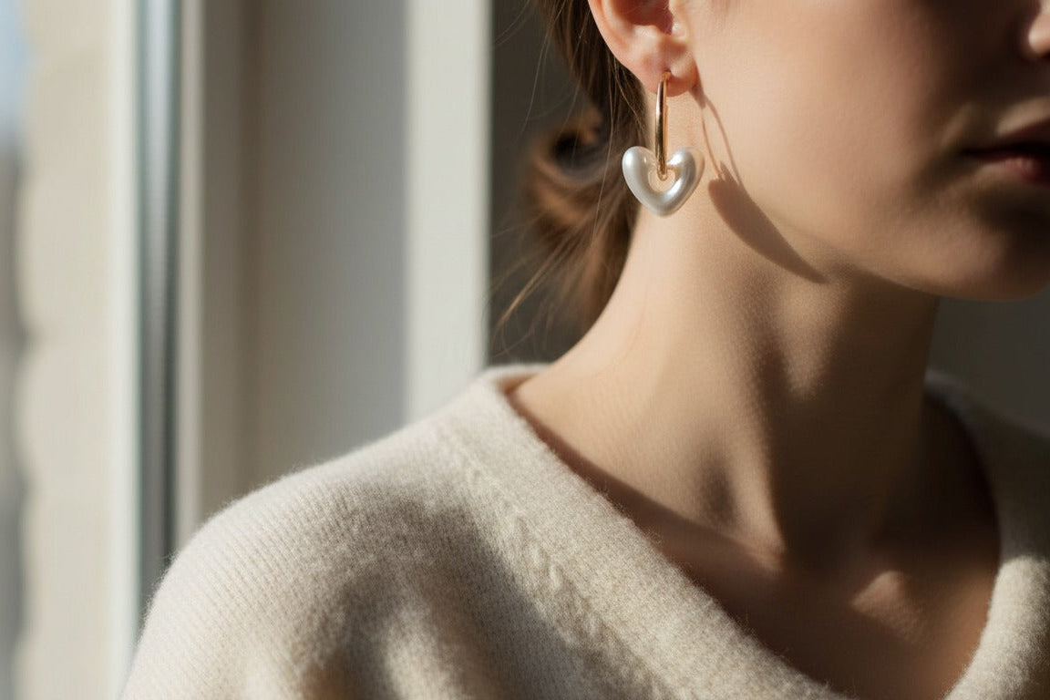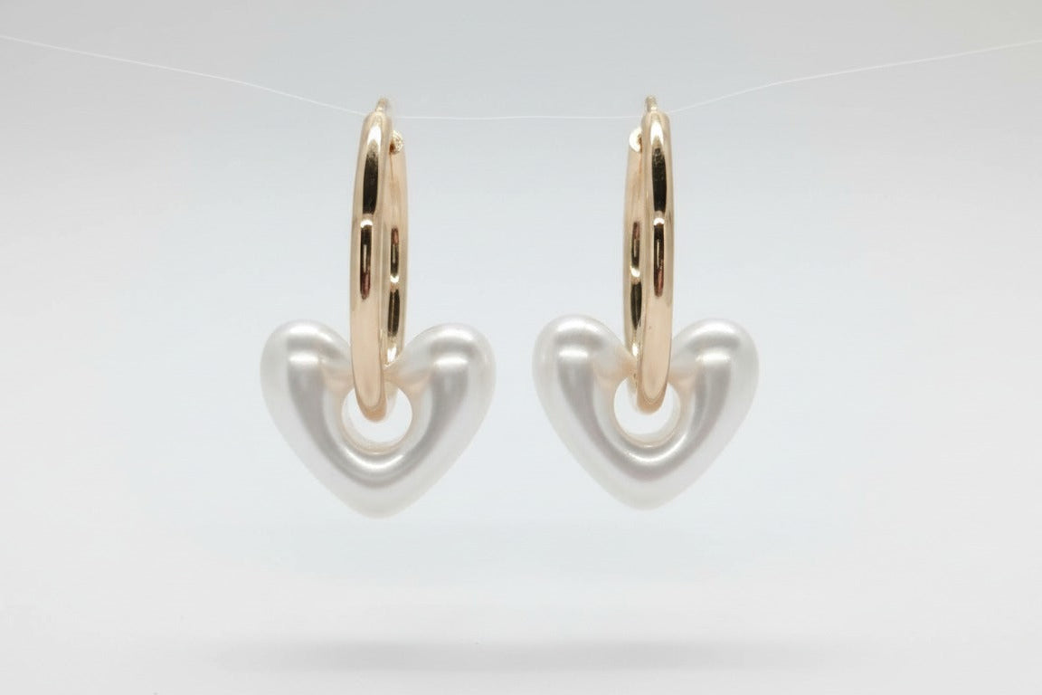 Argollas doradas con dije de corazón perlado de volumen suave. Un diseño romántico y luminoso que eleva los outfits casuales o de noche.