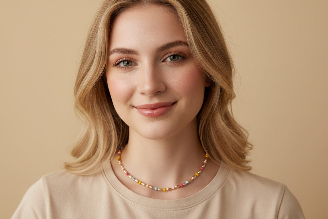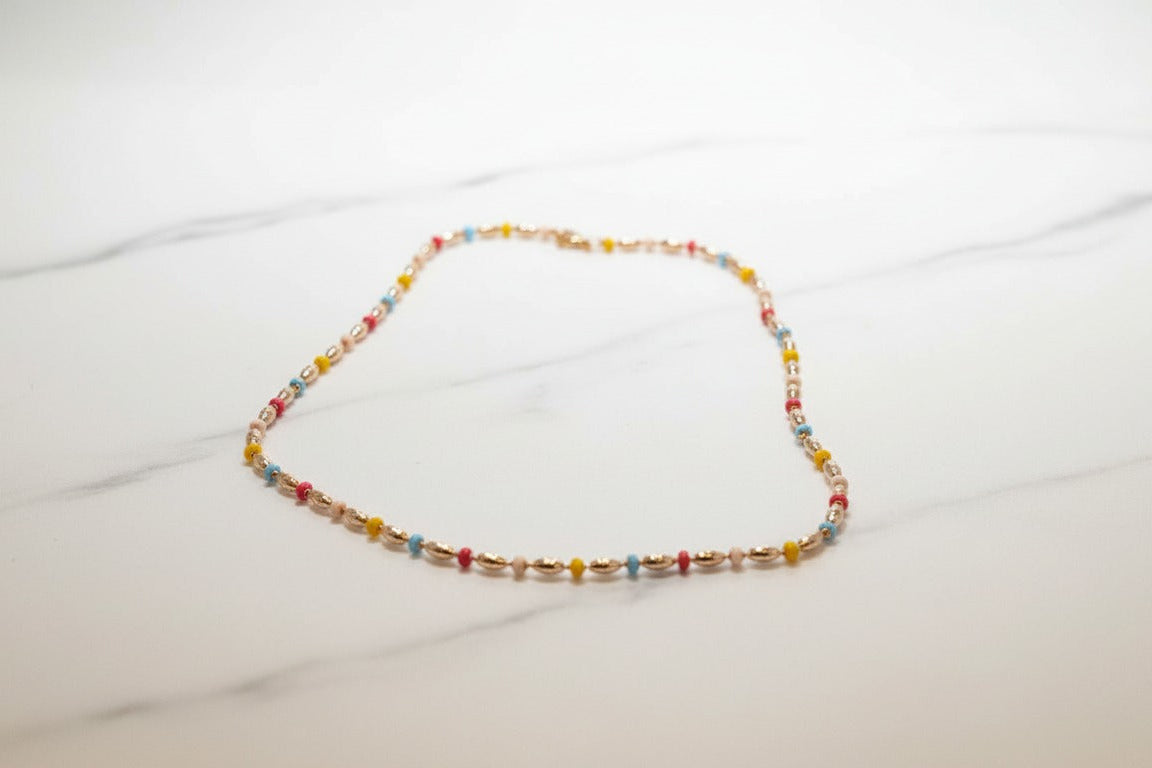 Collar de cuentas en tonos pastel que une dulzura y elegancia: microesferas en rosa, celeste, amarillo y coral se alternan con óvalos dorados pulidos. Una pieza versátil para iluminar looks diarios o de noche. Luz que se nota, propósito que se siente.