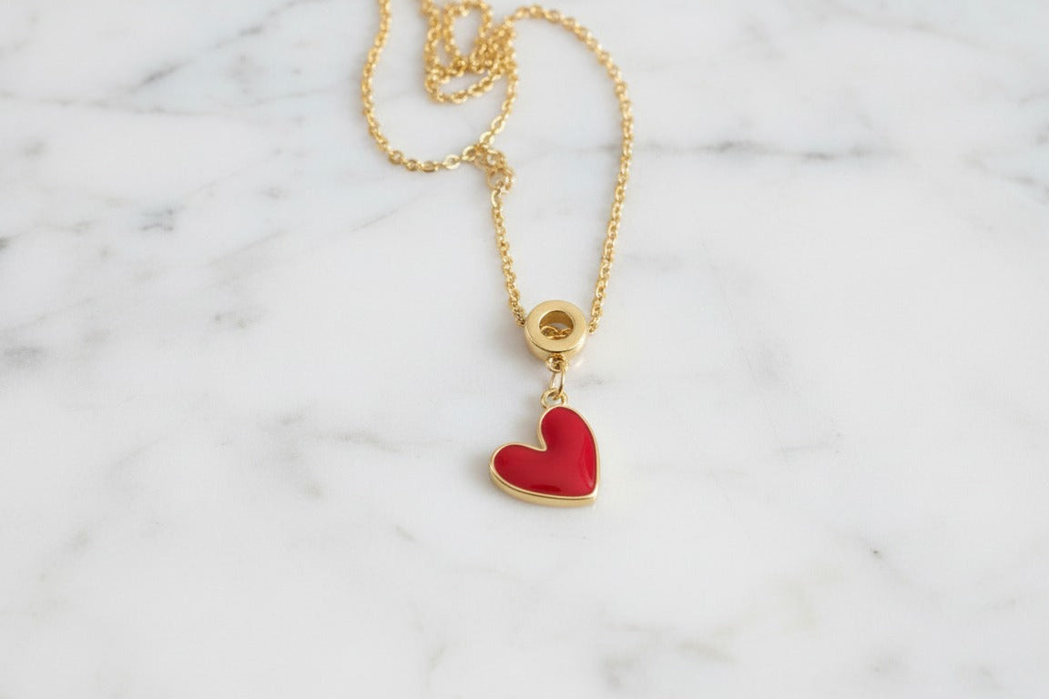 Corazón esmaltado rojo con borde dorado y bail tipo donut: brillante, tierno y muy combinable. Una pieza versátil para iluminar cualquier cadena o pulsera. Luz que se nota, propósito que se siente.